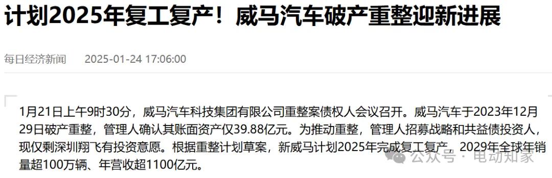 2025年1月威马债权人会议通过了重整计划草案,深圳翔飞汽车销售有限公司成为主要战略投资人,承诺投入超过100亿元。重整计划包括2025年完成温州工厂复工复产,品牌焕新,构建营销网络;2026-2027年每年推出1-2款车型,2027年销量目标超60万辆;2028-2029年全球投放10款车型,2029年销量目标超100万辆,营收超1100亿元,估值超1500亿元。