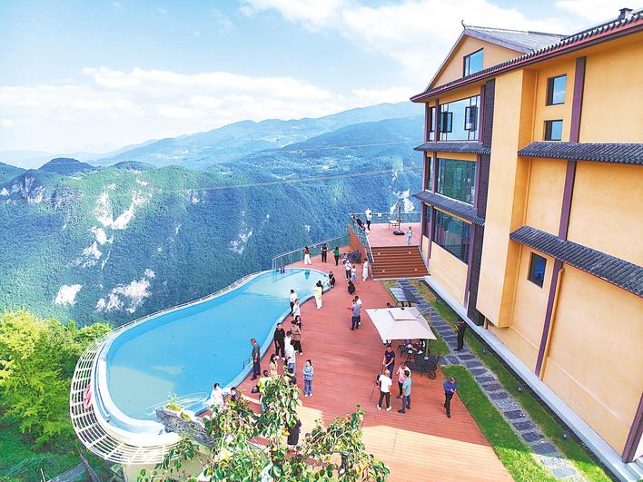 10月12日,巴东县茶店子镇悬崖民宿群内,游客正在眺望峡谷风光,打卡网红观景平台。