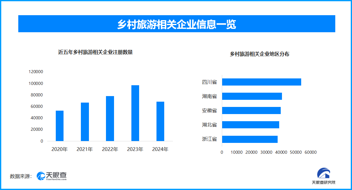 从区域分布来看,四川省、湖南省、安徽省乡村旅游相关企业数量位居前列,分别为超5.3万余家、4万余家和3.9万余家,排在其后的是湖北省和浙江省。